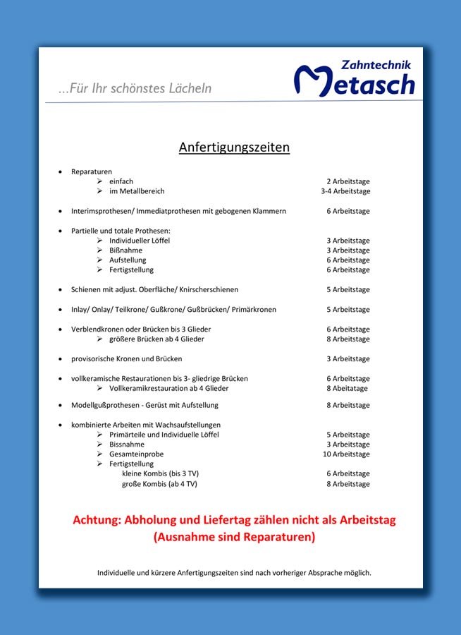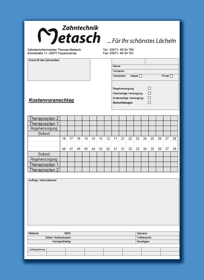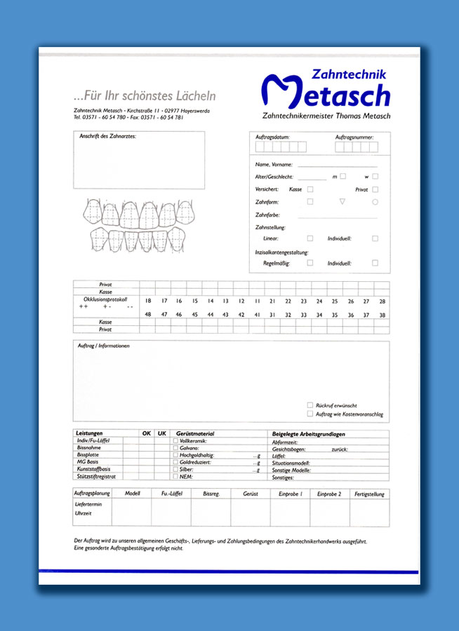 In unserem Zahnlabor legen wir großen Wert auf einen reibungslosen und effizienten Service für unsere Kunden. Daher stellen wir Ihnen hier alle wichtigen Formulare und Dokumente als praktische PDF-Downloads zur Verfügung. Ob Auftragsformulare, Laborinformationen oder Pflegehinweise – mit wenigen Klicks können Sie die benötigten Unterlagen direkt herunterladen und ausfüllen.